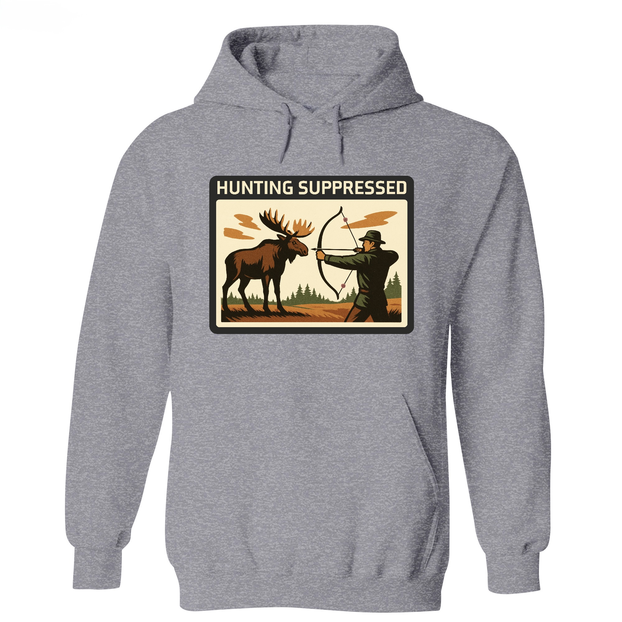 The Hunting Suppressed Hoodie. Featuring the bold, vintage-inspired design of a bowhunter at full draw on a bull moose, this hoodie combines warmth, comfort, and classic style. Built from a soft cotton-poly blend with a fleece interior, it’s perfect for chilly mornings in camp, late-season scouting trips, or just repping the lifestyle every day.