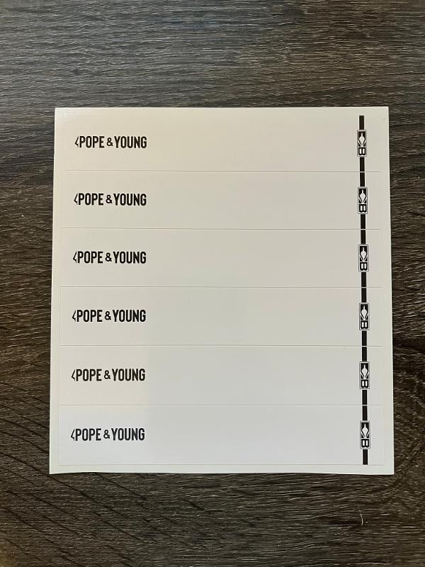 “Pope & Young Arrow Wraps” come in a 12 pack and are 5.5” Bohning white wraps with the Pope and Young logo.